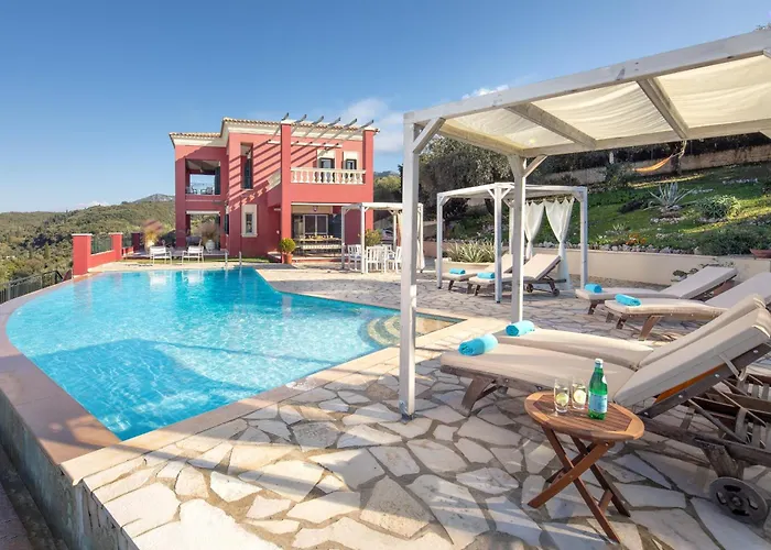 Het vakantiehuis is op 25 km van de luchthaven Corfu Ioannis Kapodistrias gelegen.Een privézwembad wordt aangeboden in de woning.